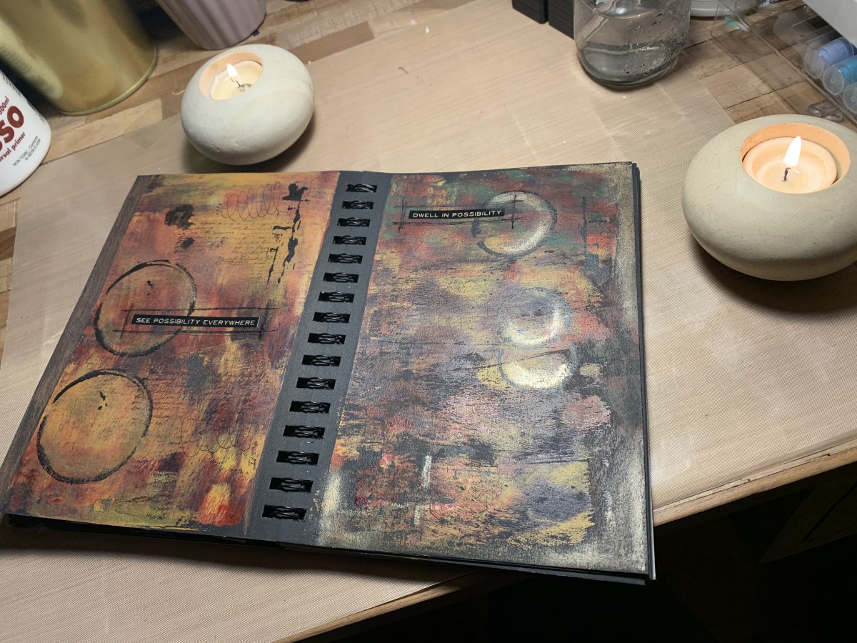 I lit a candle and cracked the first page of my art journal. Propping my phone upright, I watched a few video tutorials to learn some techniques; exploring mixed media collage, stenciling and gel printmaking. I started with an idea for the theme and pondered how it could be expressed with colours, images and textures. New thoughts, shapes or designs emerged through layering and I reveled in discovery. Details, words and sayings were then added to bring meaning and a focus to the spread.