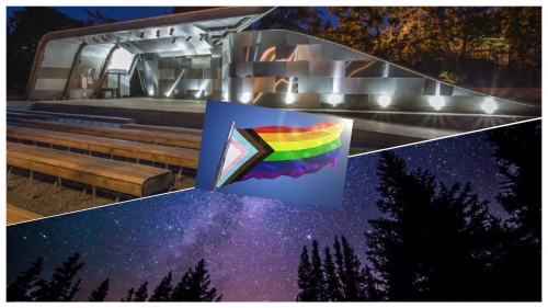 A PERSON in silhouette walks by the sign, and a small amphitheater stage comes into view. The stage is carved into the hill the observatory sits on and complements the natural landscape, the stage floor is wooden, and the stage is backlit with white LED lights to add ambience and atmosphere, but not interfere with seeing the beauty of the night sky. TOM WILLIAMS (37) is standing center stage. Tom is a theatre kid at heart and an academic, has a medium build, a short well-kept beard, hair that can best be described as “bro flo” meets windswept, is wearing a dark blue button up denim shirt, burgundy red traveller pants, an orange/red/brown checked scarf around his neck, and brown slip-on sketchers. Tom is at the beginning of a talk on storytelling.